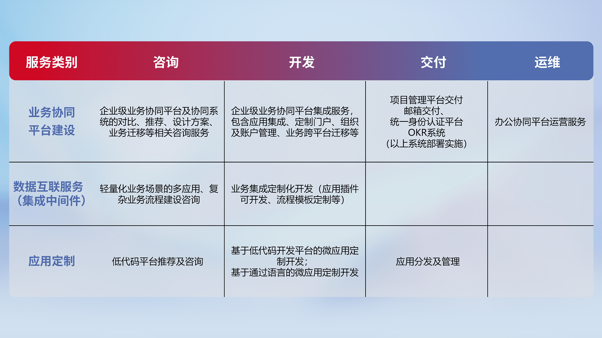 针对钉钉、、、企微、、、IDaas等平台级产品提供产品的规划、、方案、、、、交付、、、定制化开发等服务,,,实现如统一协同办公、、、、智能客户服务、、、、混合会议管理、、、、智能数据查询、、、等业务场景,,实现数字化转型。。。