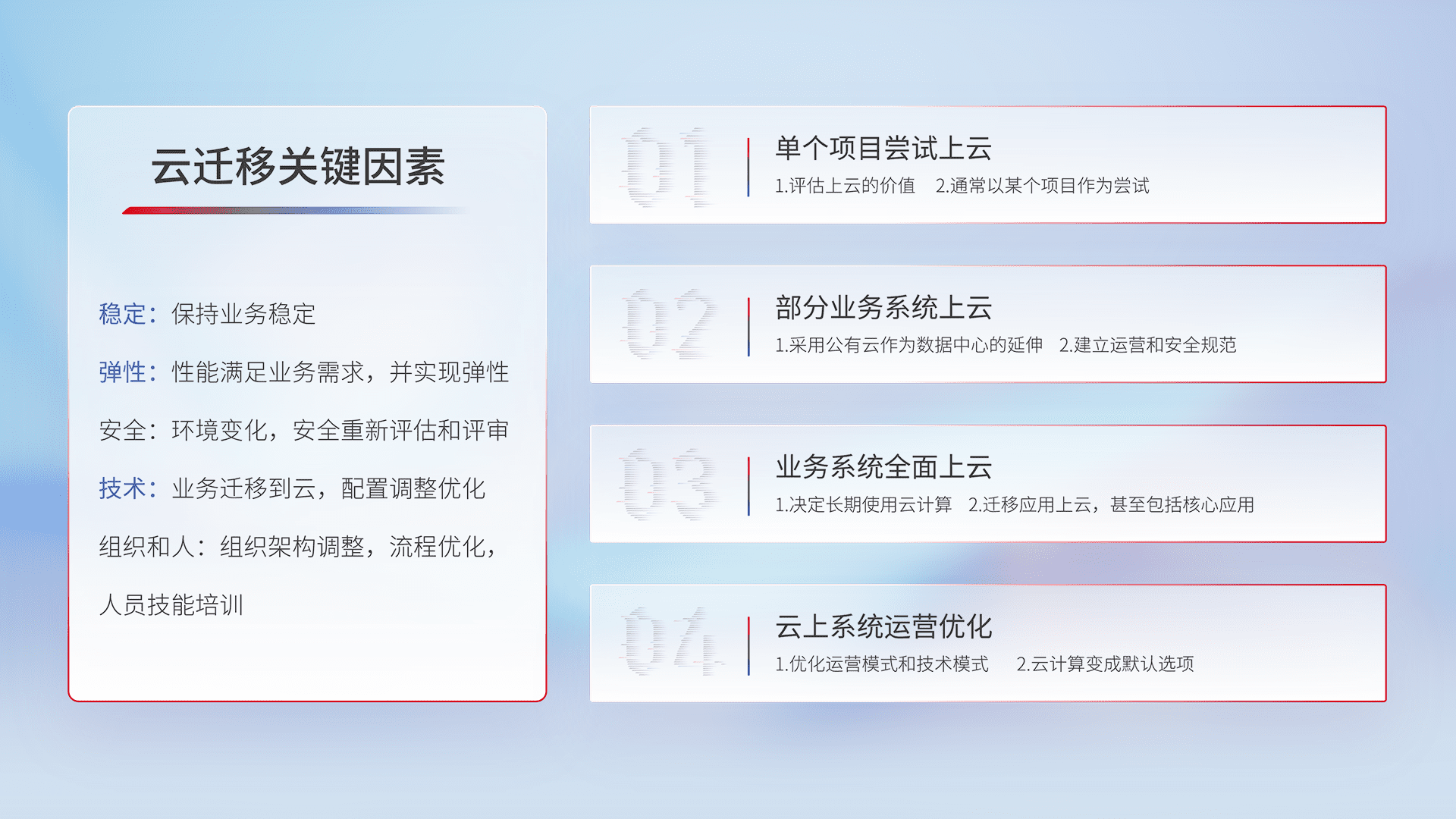 结合实际业务,,,从规划设计、、、、云平台选型、、、、云原生改造、、数据迁移、、、集成交付,,,迁移全过程为客户识别最佳上云路径,,,,做好风险识别管理,,设计网络架构、、身份权限、、、安全审计合规、、、、操作审计、、日志审计、、、监控告警策略、、多站点容灾设计等,,,对云上基础设施进行整体规划,,,提升IT治理水平,,以满足弹性、、高可用、、、、高性能的需求。。。
