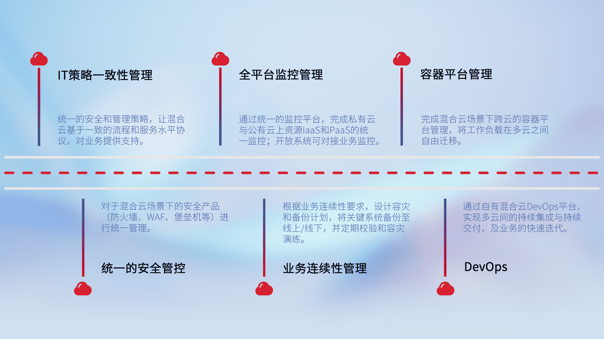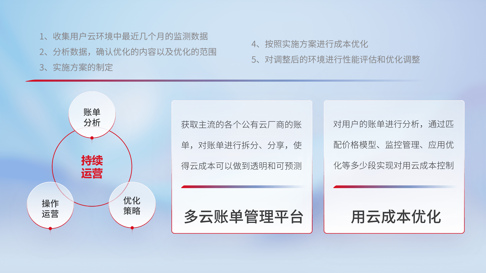通过多云纳管,,,,以统一的资源数据模型把客户的云资源进行抽象和封装,,,进而实现对多云资源的统一操作,,保障云资源管理的可靠性、、、稳定性与可用性。。。。量身定制化运维内容,,,配置、、开发运维、、补丁管理、、备份、、、监控、、认证和访问管理、、、审计和日常巡检等,,,保障在用云过程中的可靠度,,稳定度以及高可用率。。。