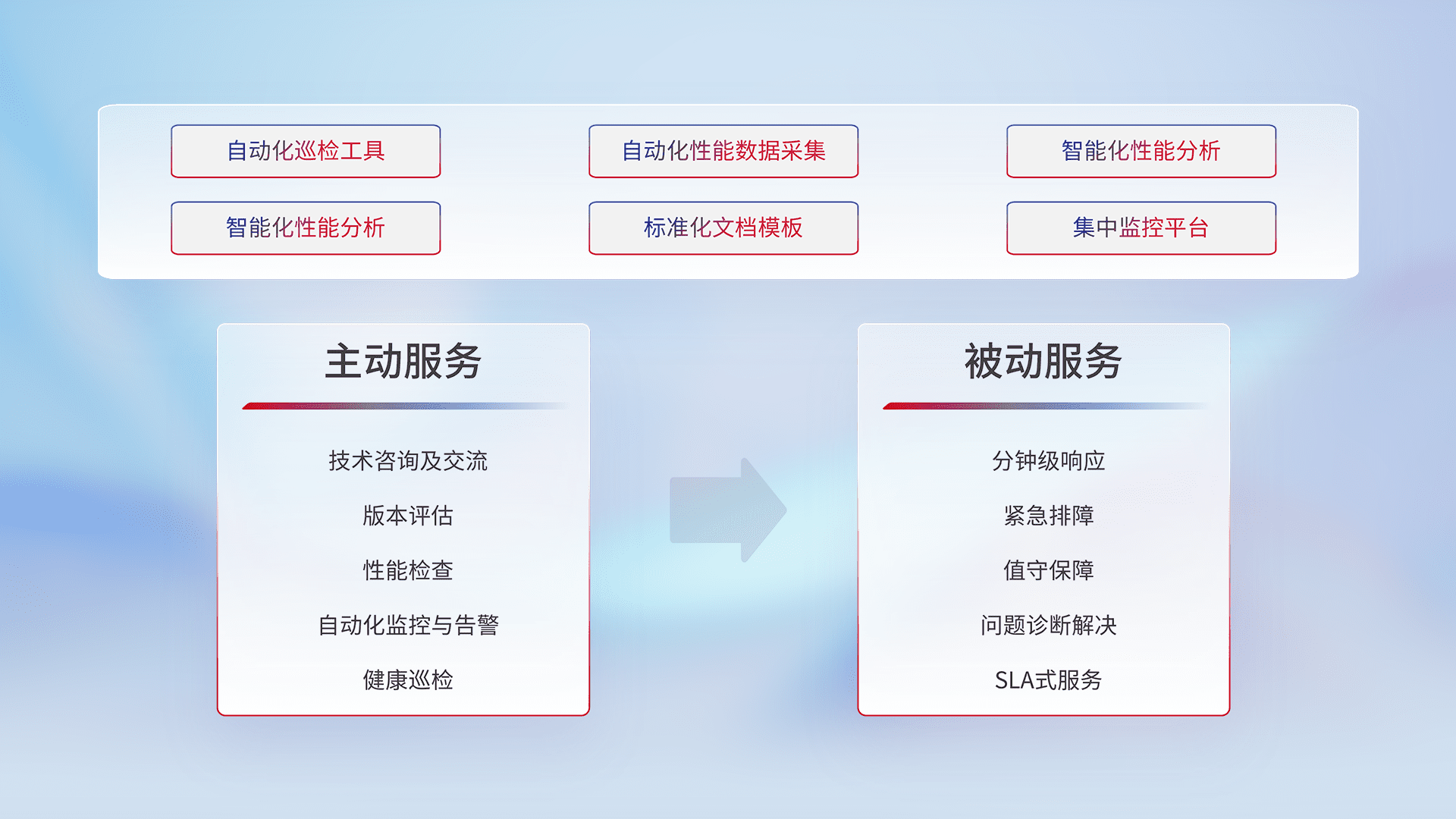 智能化工具和标准化文档,,,,保障服务质量,,,提供主动服务(包含技术咨询、、、、版本评估、、、、性能检查、、、自动化监控与告警、、、、健康巡检)和被动服务包含(分钟级响应、、紧急排障、、、、值守保障、、问题诊断解决、、、、SLA服务)。。